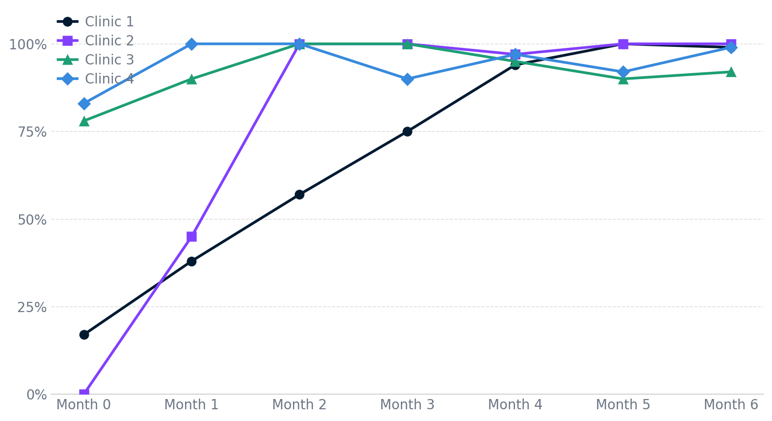 Clinics that come into Bridge's program with low chart audit scores don't stay there. The chart below shows audit pass rates for four clinics over their first six months in Bridge's program, each starting from a different baseline, all converging toward the same standard.